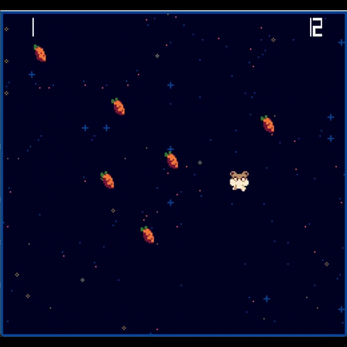 Arrow keys to move, space bar to roll (gives a huge speed boost that wears off quickly, hard to change directions once you start). Once time is up, press "r" to restart! Run over the carrots to eat them, The top left is your score, the top right is the time left, you will always have 60 seconds. Your score will be displayed in the center of the screen if the time is up.